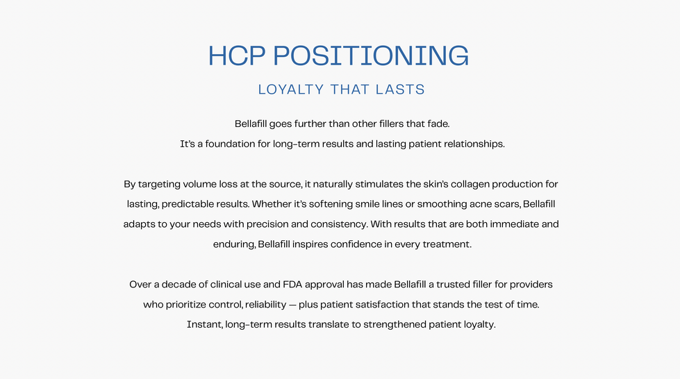 The Approach: I crafted a new brand story, refined the positioning, and developed tagline concepts that highlighted Bellafill’s longevity and collagen-boosting power, setting it apart from short-term filler options.